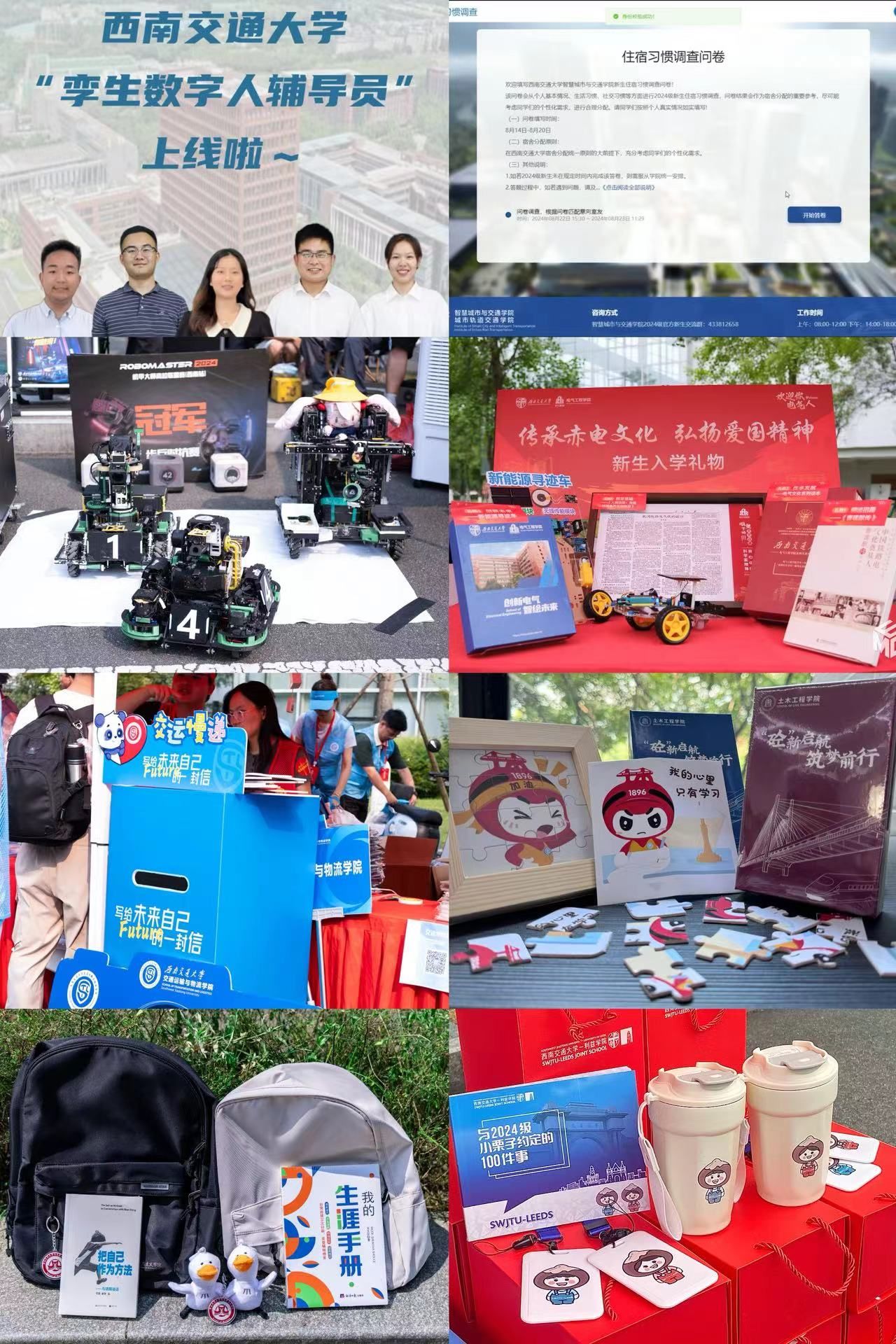 各学院为新生精心准备专属新生礼,“科技感”与“暖心度”同步在线。智慧城市与交通学院打造“智慧公寓系统”,以人工智能算法帮助新生匹配习惯相似的室友,提升宿舍分配的科学性和便捷性。计算机与人工智能学院启动“孪生数字人辅导员”项目,通过打造智能化、个性化的“辅导员工作助手”,以更加便捷、高效且深受大学生喜爱的方式陪伴学生成长。机械工程学院在迎新现场安排机器人展示讲解环节,邀请新生遥控实操,引导新生深入感受机械乐趣,激发学科热爱。电气工程学院为新生送上“电气系列”读本、《人民日报:我国铁路电气化的途径》、《曹建猷传》,并悉心准备“新能源寻迹车”,以文化为传承,以实践为启蒙。交通物流与运输学院在迎新现场设置“交运慢递邮局”,收集本科新生《写给未来自己的一封信》,并将在四年本科结束之际返还,给新生送上学院的专属“浪漫”。土木工程学院将学院标志性吉祥物“红小土”与“交大工程”以拼图形式精美包装,巧妙融入充满惊喜与期待的“开盲盒”体验。马克思主义学院为新生准备书籍《我的生涯手册》和《把自己作为方法》、利兹学院准备“和栗子约定的100件事”打卡记录册,引导新生细致规划入学目标,助力生涯启蒙和学生成长。