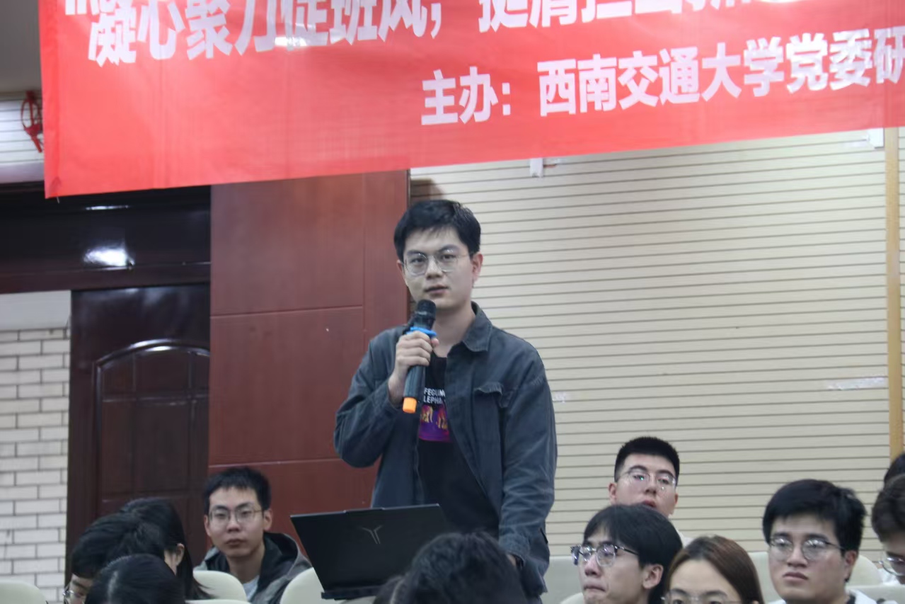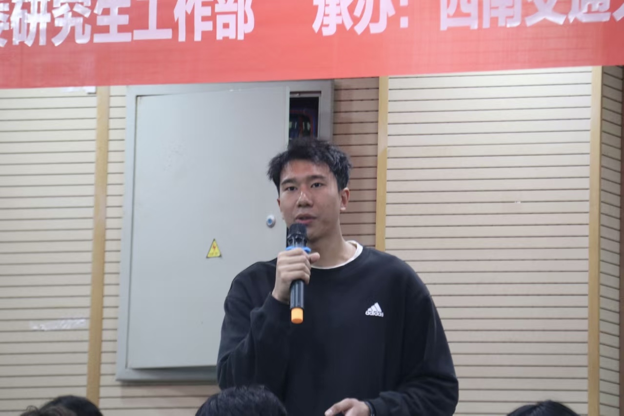 第三位班委是研究生忠忱班集体的优秀代表,来自轨道交通运载系统全国重点实验室2022级硕士4班班长王善硕。他分享了在日常事务管理及班级团队建设等方面的经验,指出在班级活动建设中要组建好班委团队、充分利用好班级同学特长、辅导员老师经验分享及学校硬件设施等周边资源,强调了组织健全、分工合作的重要性。