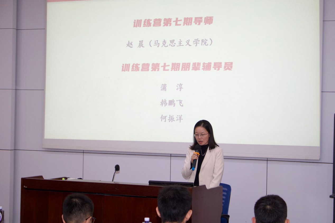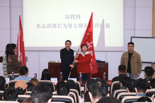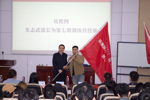 胡广翰老师介绍了本期训练营的具体内容与安排。本期训练营在原有培训方案基础上进行优化,重点将德智体美劳融入培训,为训练营设置了朋辈辅导员和导师,并持续开展团队建设、励志讲坛、力行实践等课程,设置调研报告环节、挂职锻炼实习等活动。会上,李莹副部长宣读了本期训练营的导师、朋辈辅导员名单及参训营员分班名单,并为导师赵晨、朋辈辅导员蒲淳、韩鹏飞、何振洋颁发了聘书。朱志武部长为第七期训练营授旗,学员代表罗强、何思汝同学接旗。