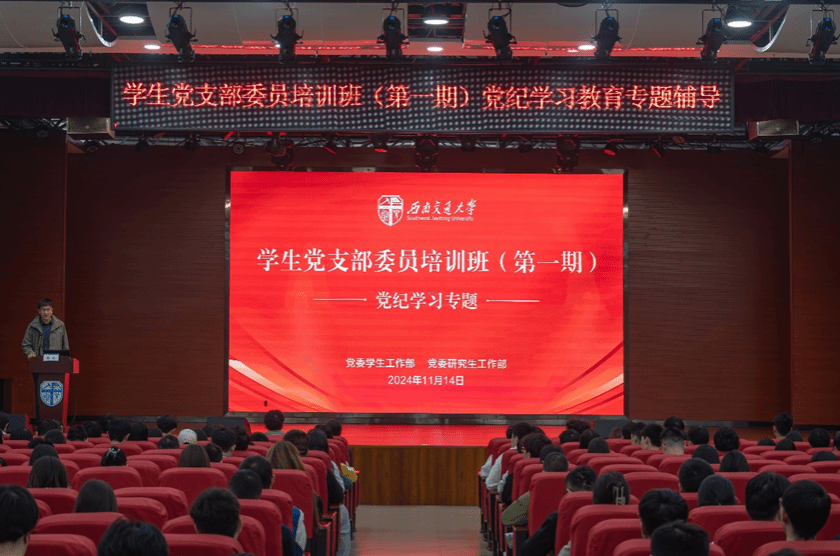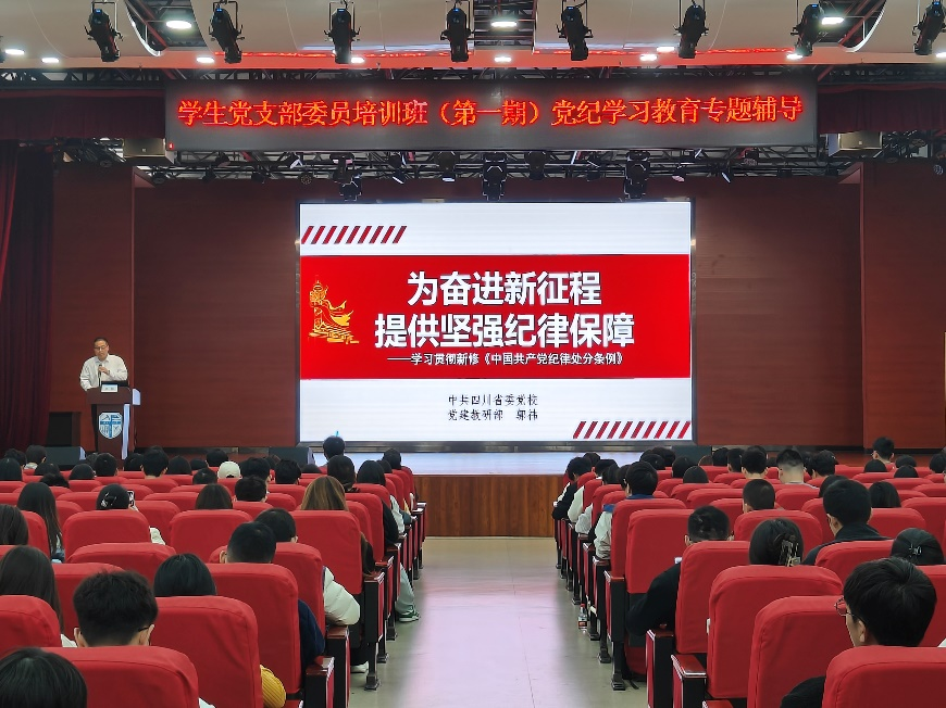 为深入学习贯彻习近平总书记关于全面加强党的纪律建设的重要论述精神,切实巩固主题教育成果,促进研究生党支部书记增强政治意识,,11月14日下午,学生党支部委员培训班(第一期)党纪学习教育专题辅导在犀浦校区一食堂三楼大学生活动中心举行,中共四川省委党校(四川行政学院)党建教研部郭祎教授、党委研究生工作部李莹副部长及300余名各学生党支部委员参加本次活动。