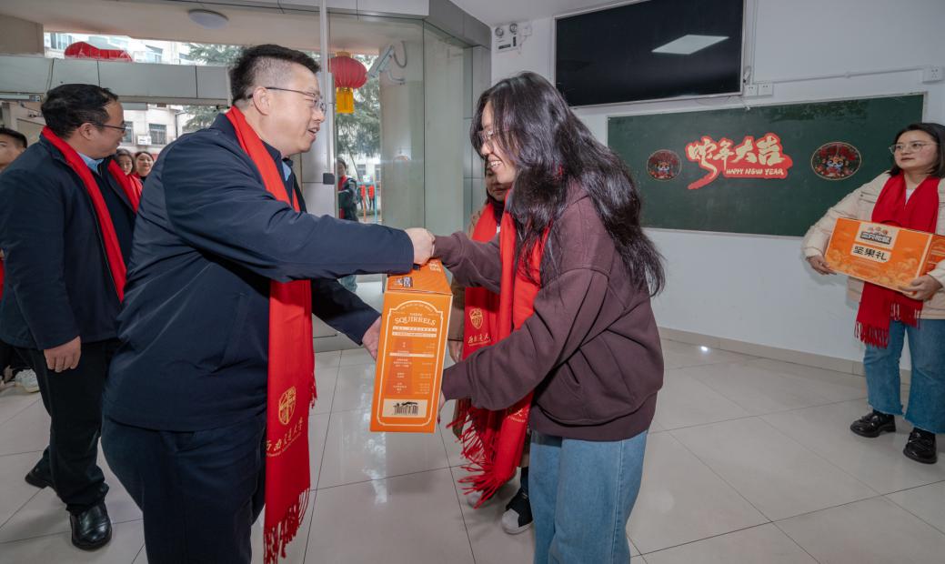 夏书记还详细介绍了学校寒假期间的保障措施。他指出,学校为留校研究生提供了全方位的生活支持,包括宿舍的水电供应、自习室的有序开放等,并特别提醒同学们要注意防火、防盗和交通安全,确保度过一个平安、祥和的春节。活动现场,学校领导为留校研究生发放了新春大礼包,同时学校还为同学们准备了春节餐券和电影票,让大家在春节期间吃一顿热热闹闹的年夜饭,过一个欢欢乐乐的喜庆年。