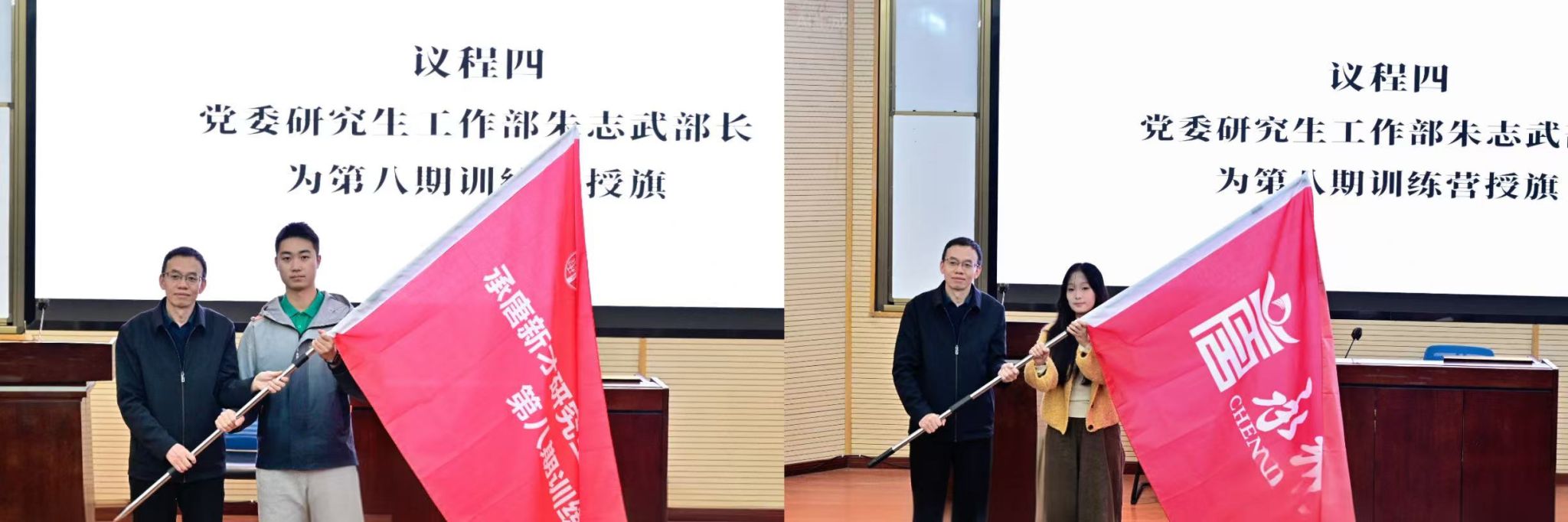 罗丹老师介绍了本期训练营的具体内容与安排。本期训练营在原有培训方案基础上进行优化,重点突出德智体美劳五育融合。会上,李莹副部长宣读了本期训练营的导师及参训营员分班名单,并为导师程怡然、胡睿颁发了聘书。朱志武部长为第八期训练营授旗,学员代表任俊杰、王晓雨同学接旗。