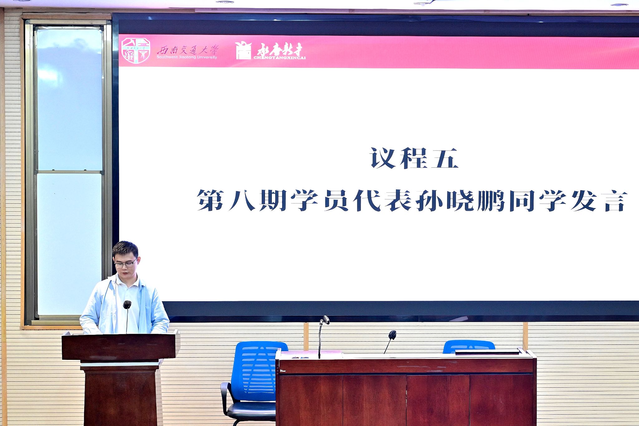 第八期学员代表孙晓鹏同学首先对承唐新才训练营表示衷心感谢,并围绕“忠恕任事、果毅力行、精勤求学、敦笃励志”的交大校训,倡议全体新生骨干争做务实暖心的“服务者”、脚踏实地的“实干者”和率先垂范的“领航者”。他号召大家以此次培训为起点,将荣誉化为责任,积极服务同学,担当实干,凝聚集体,共同营造学风浓厚、团结奋进的集体,不负学校的培养期许。