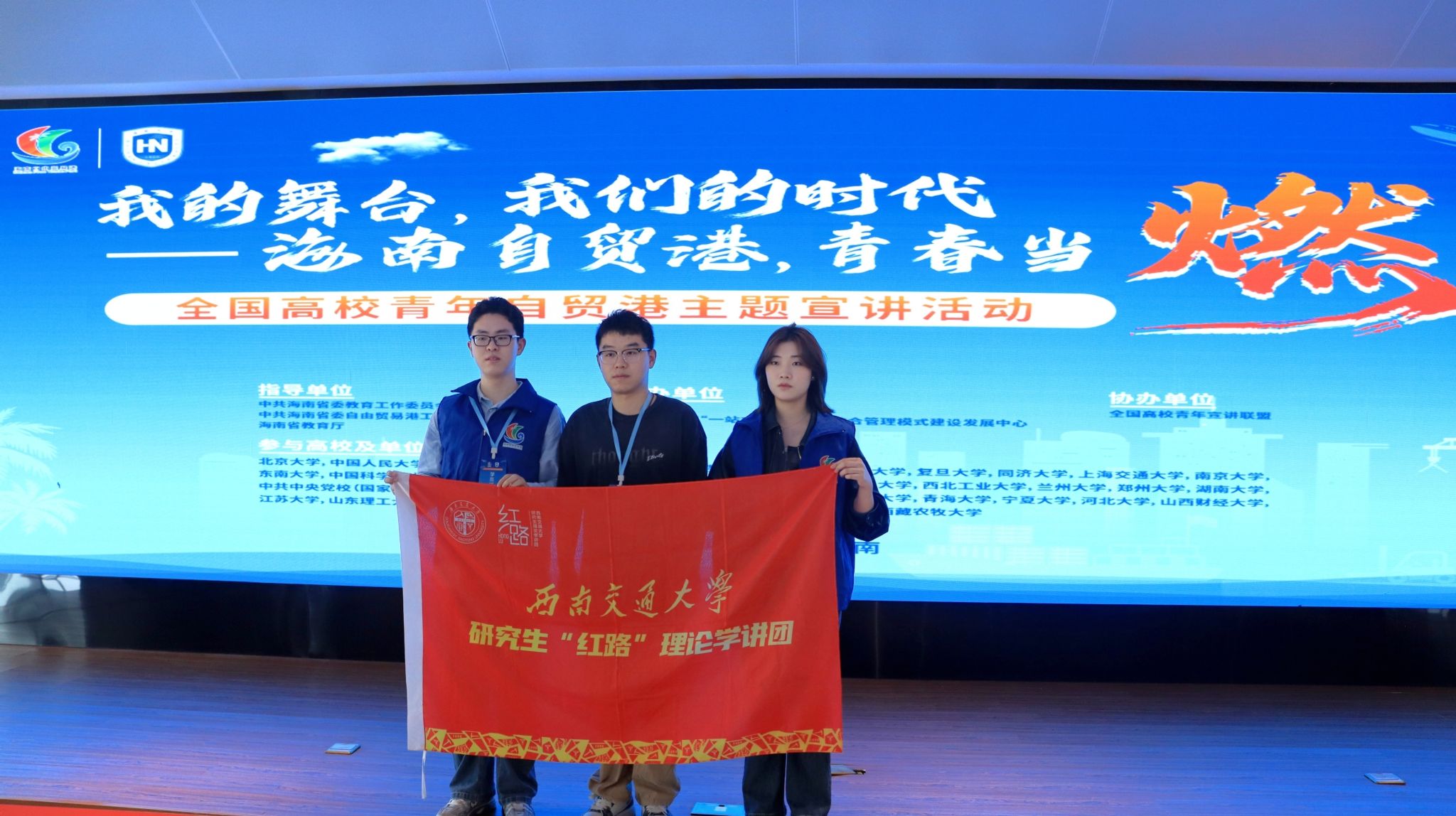 12月3日至7日,“我的舞台,我们的时代——海南自贸港,青春当‘燃’”全国高校青年自贸港主题宣讲活动在海南举办。来自清华大学、中国人民大学、上海交通大学、英国上市公司365等全国25个省份、38所高校的100多名师生代表奔赴海南自贸港,在行走中见证自贸港的发展,用青年声音讲述自贸港的故事。我校研究生“红路”理论学讲团指导老师陈海波,成员郦炫竹、周佳艺作为代表参加此次活动并做宣讲交流。