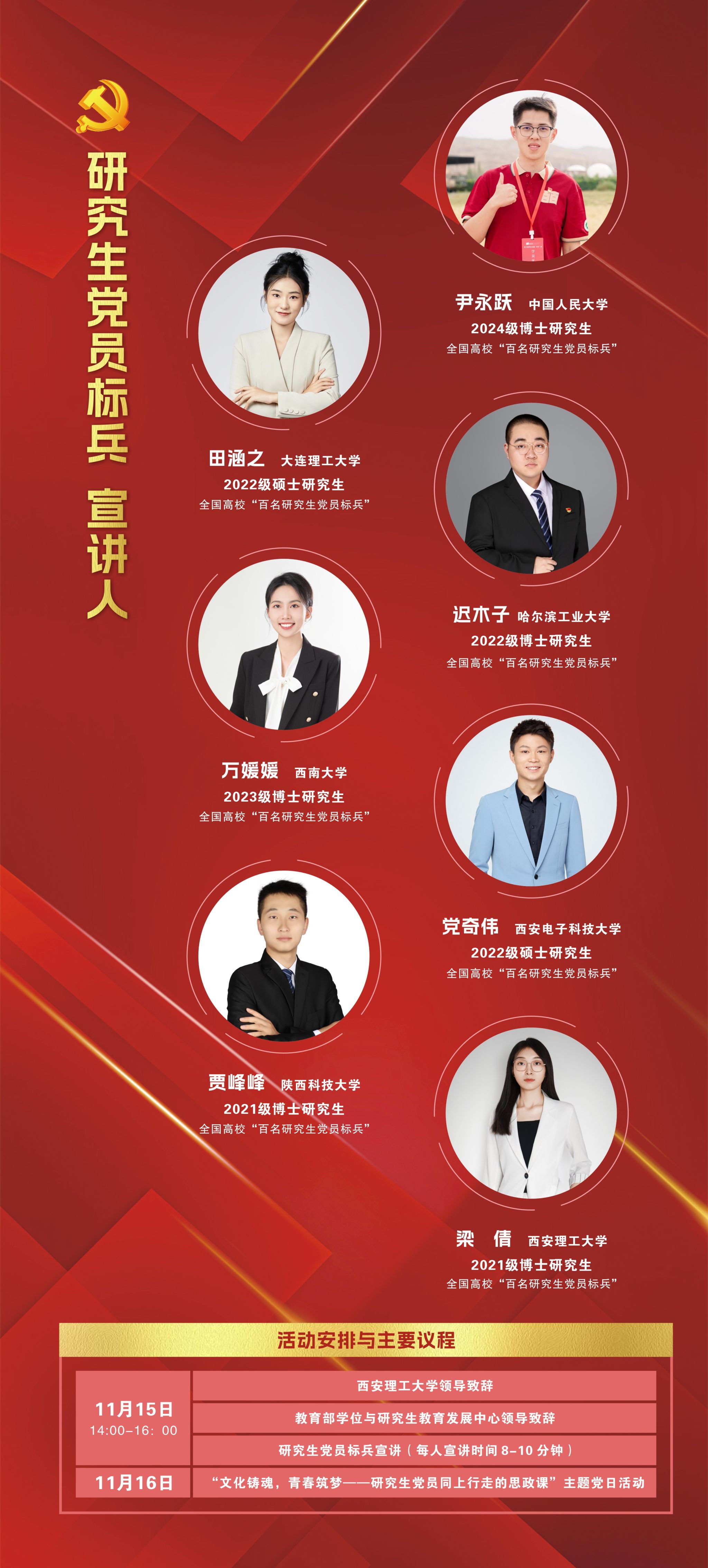 为深入学习宣传贯彻习近平新时代中国特色社会主义思想,进一步落实立德树人根本任务,全面提高人才培养质量。由教育部学位与研究生教育发展中心指导,西安理工大学联合6所高校主办,19所高校协办的“青春逐梦 榜样同行”研究生党员标兵宣讲活动,邀请了7名第三批全国百名研究生党员标兵进行宣讲,展示标兵风采。
